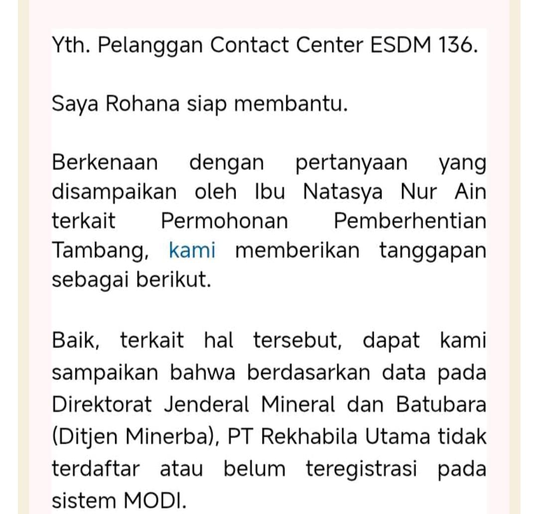 Dalam balasan resmi Kementerian ESDM melalui Contact Center ESDM 136 atas nama Rohana, tertanggal 9 Oktober 2025, disebutkan bahwa “Berdasarkan data pada Direktorat Jenderal Mineral dan Batubara (Ditjen Minerba), PT Rekhabila Utama tidak terdaftar atau belum teregistrasi pada sistem MODI.” Mak dari itu, juru bicara warga Padangpoko yang minta tambang tersebut ditutup yaitu Rusdin, mendesak aparat kepolisian khususnya Polda Sulsel agar segera menindak tegas para penambang ilegal tersebut.
